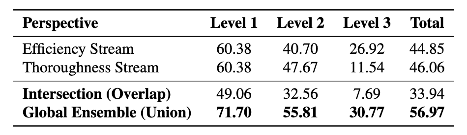 视角驱动探索的设计得到了实验验证。如下图所示,效率流(Efficiency Stream)和周全流(Thoroughness Stream)的总体准确率相近(44.85% vs 46.06%),但两者解决的问题重合度仅为 33.94%,这意味着约 23% 的问题只能被其中一个视角解决。