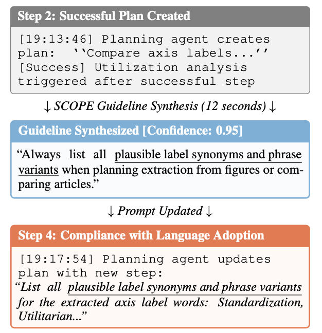 如下图所示,研究团队观察到了 "语言采纳" 现象:当 SCOPE 合成了 "始终列出所有可能的标签同义词和短语变体" 这一规则后,Agent 后续输出中直接引用了相同的措辞。这表明规则被整合到了 Agent 的决策过程中。此外,行为变化通常在规则合成后几秒内就会发生,展示了单个任务内的实时适应能力。