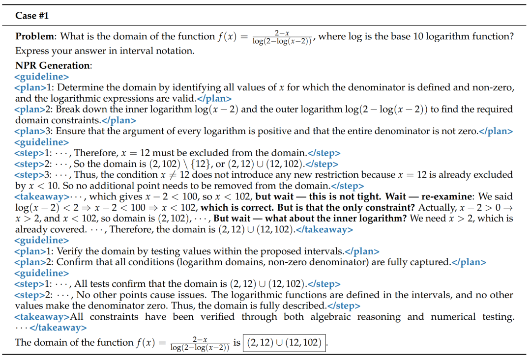 举例:对于域函数或几何题,某些 plan 会分别做不同的分解(代数、数值检验、几何角度关系),最后 <takeaway> 将各分支结果比对、剔除不一致项并输出最终答案。这种「多角度并行 + 汇总」能显著减少因单一路径假设错导致的花费。