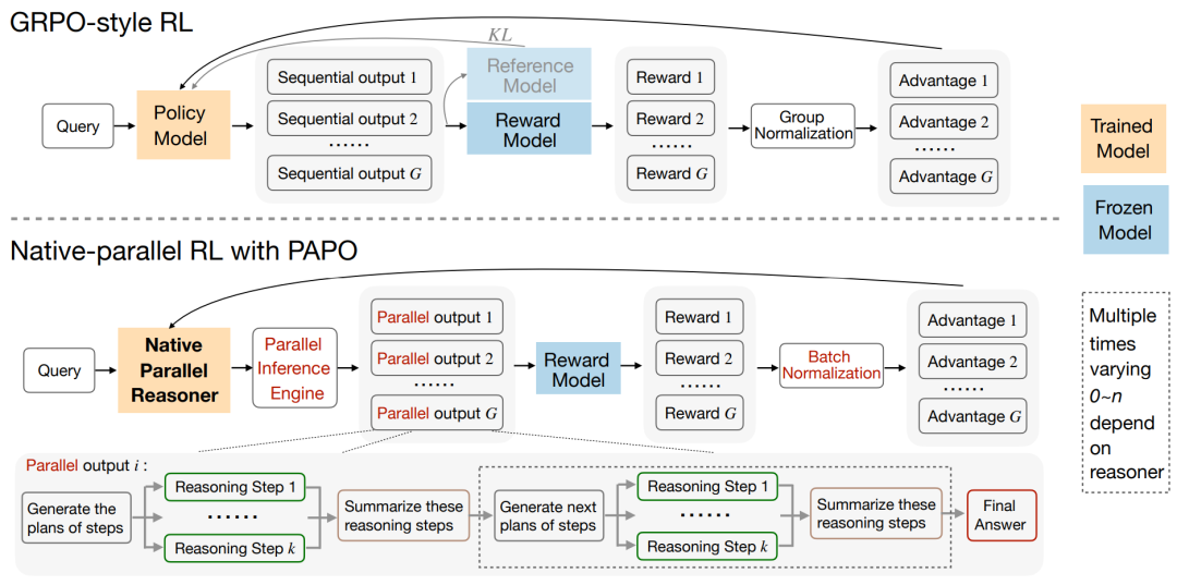 现有推理引擎、强化学习算法对「分支 — 聚合」结构往往缺乏原生支持:推理引擎难以高效调度并行分支;常用 RL 技术可能会截断或削弱触发并行结构的特殊控制词元梯度,从而阻碍模型学习严格的并行控制逻辑。