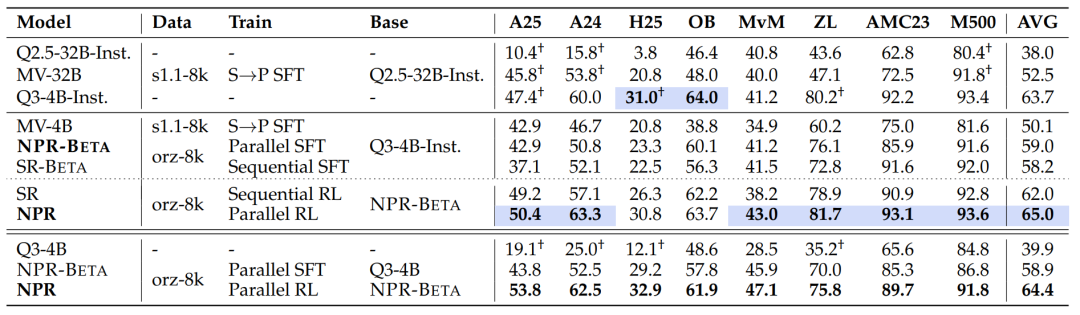 并行强化学习优势:基于 NPR-BETA,应用并行强化学习算法可获得进一步的性能提升,并始终优于顺序强化学习(NPR 与 SR 相比)。这些改进是广泛而系统的:AIME24 从 57.1 提升至 63.3(+6.2),HMMT25 从 26.3 提升至 30.8(+4.5),Minerva-Math 从 38.2 提升至 43.0(+4.8)。其他基准测试也显示出稳步提升,AIME25(+1.2)、OlympiadBench(+1.5)、ZebraLogic(+2.8)、AMC23(+2.2)和 MATH500(+0.8)。总体而言,平均得分从 62.0 提升至 65.0(+3.0)。