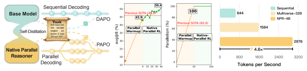 更重要的是,NPR 的突破点不只是「并行生成的工程技巧」,而是提出了一套「自蒸馏 + 并行强化学习」三阶段训练范式,并配套专门的并行推理引擎,目标是让并行推理从外挂变为模型的原生认知能力。