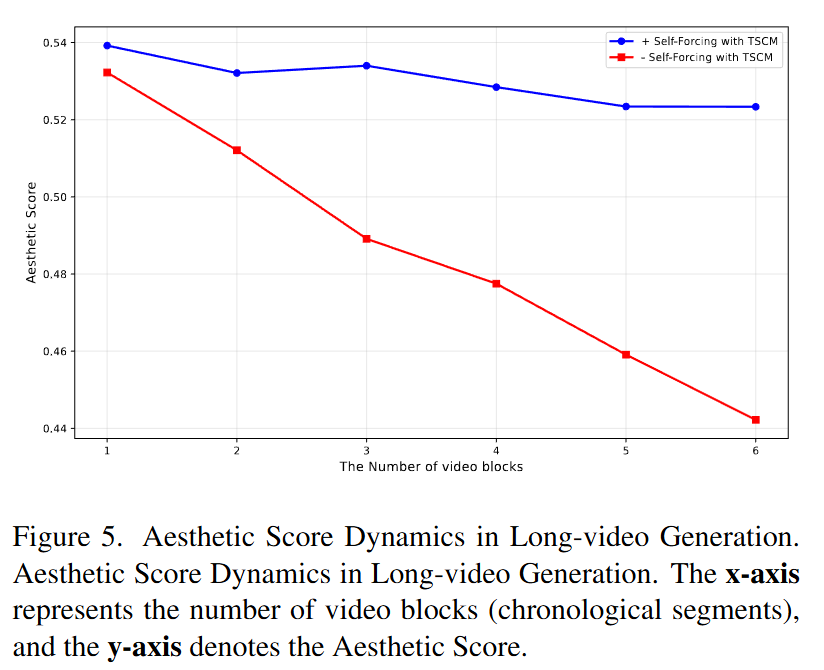 本文的方法与 Self-Forcing 的不同之处在于消除了 KV 缓存并引入了 时空通道建模 (TSCM),从而能够利用更长的上下文信息。