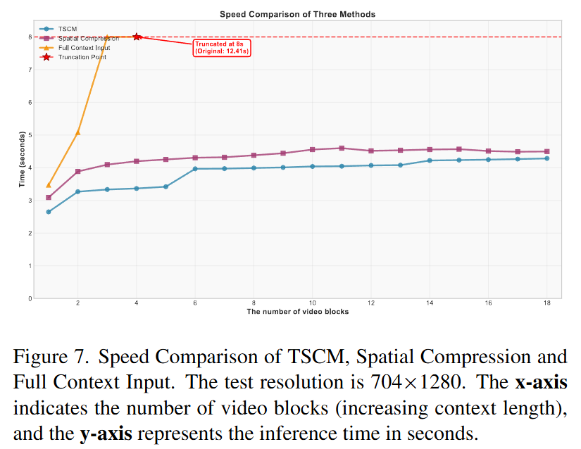 小结。由于标准注意力的计算成本对输入 Token 的数量敏感,通过时空压缩来压缩历史帧,并在 DiT 块中使用标准注意力将其与预测帧一起处理。相反,由于线性注意力对通道维度敏感,对历史帧应用通道级压缩,并在 DiT 块的线性注意力层中将其与预测帧融合。通过这种方法,本文实现了联合时空通道压缩,同时保持了生成质量。