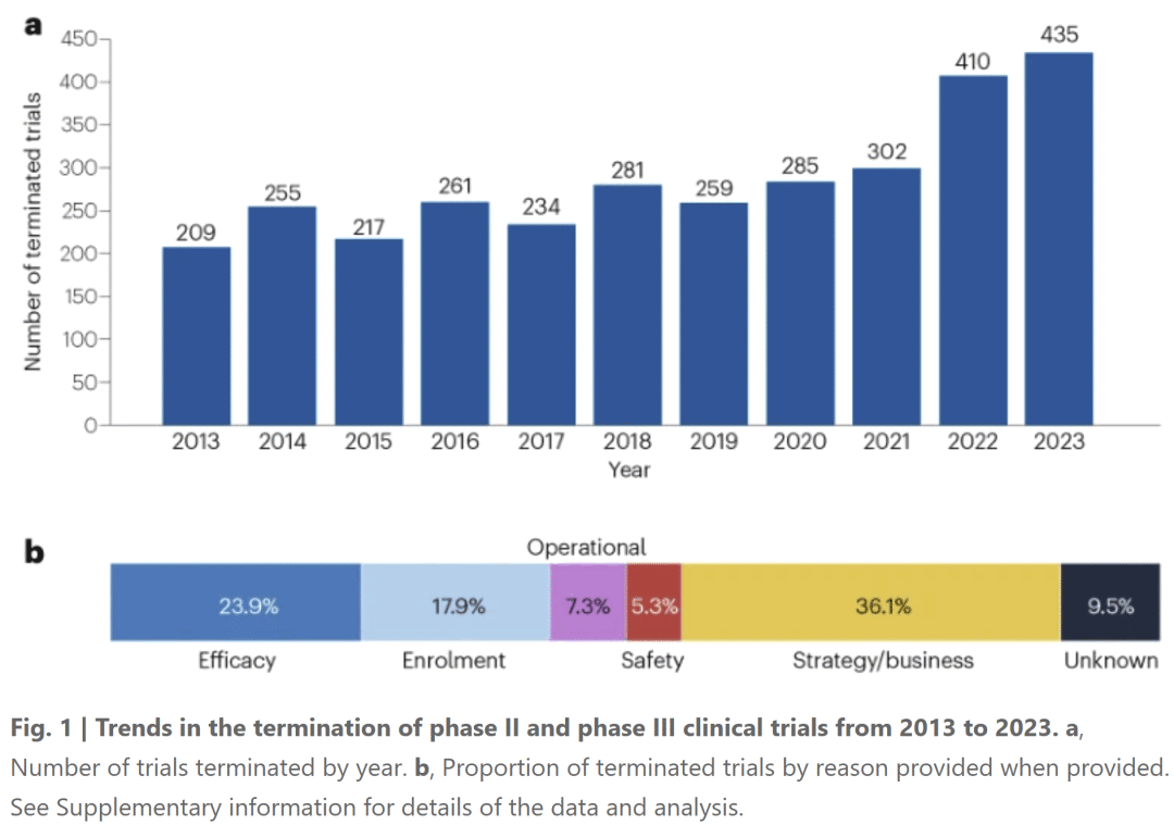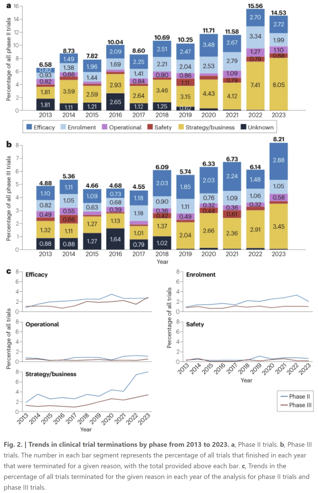 降低因疗效不足导致的临床失败仍是药物研发的核心目标之一,例如通过优先选择具有明确人类遗传学证据支持的靶点。然而,数据表明,因疗效不足而终止的 II 期和 III 期试验比例在过去十年中同样呈上升趋势。对已完成但因疗效失败的试验进行进一步系统分析,将有助于更全面评估当前应对疗效失败策略的实际效果。