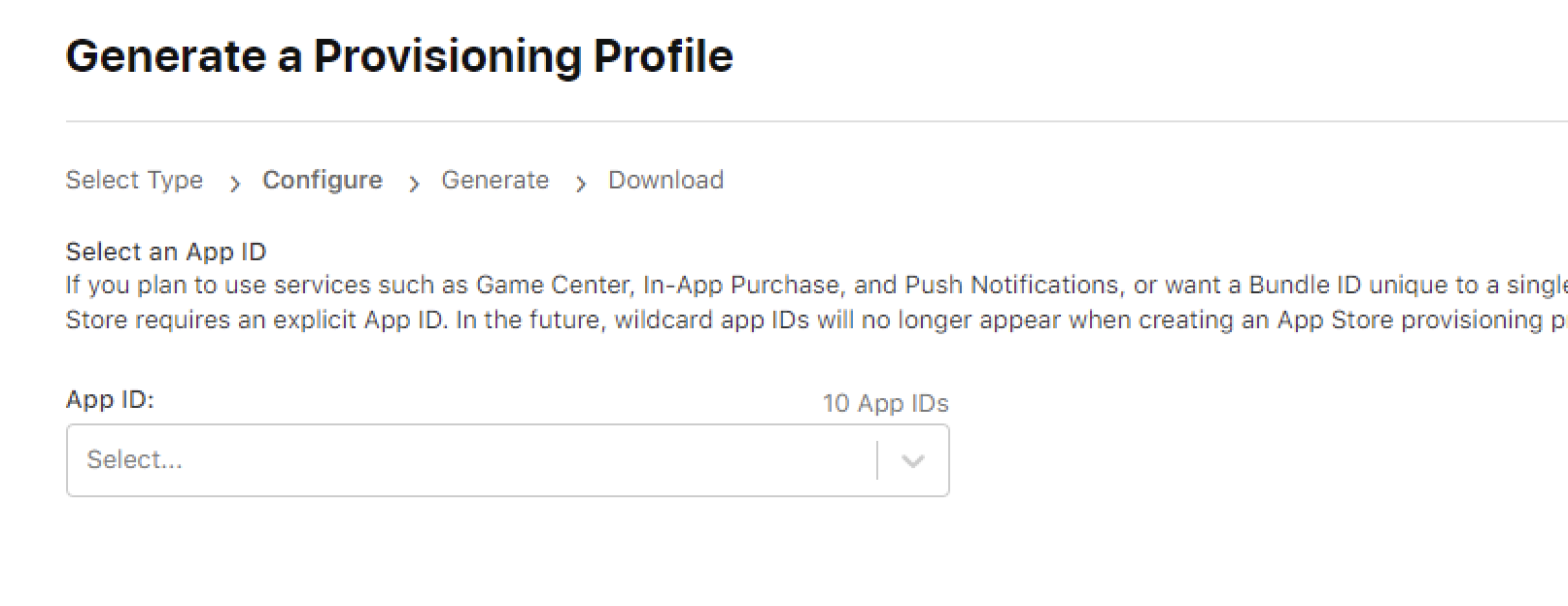 3、这时候发现还不能创建profile文件,它让我们选择appId,因此需要先创建appId。假如之前已经创建了appId就不用再创建,如下图: