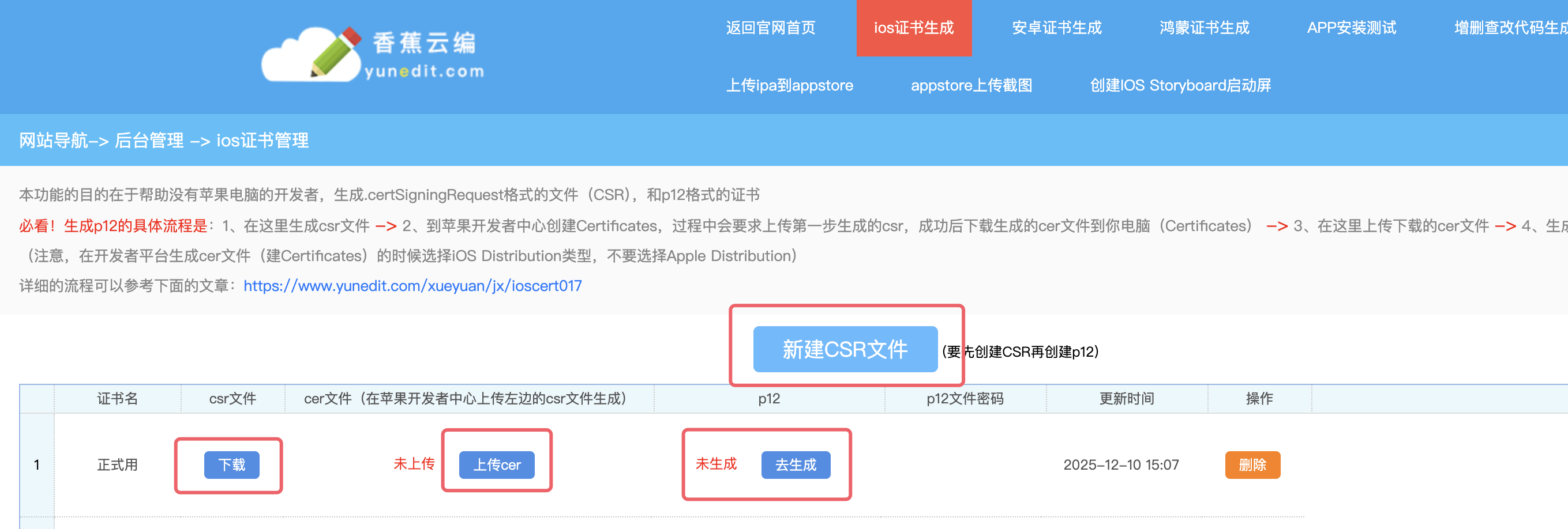 (2)香蕉云编:可选。假如是windows电脑或linux电脑申请证书,可以使用香蕉云编来生成,一般没有mac电脑的朋友们,做uniapp开发都是使用香蕉云编来辅助生成对应的csr文件和将cer文件导出到p12格式。因为在苹果开发者中心生成cer证书,需要提供csr文件,而生成完cer文件后,还需要打出成uniapp打包的私钥证书格式。可以使用香蕉云编来完成。