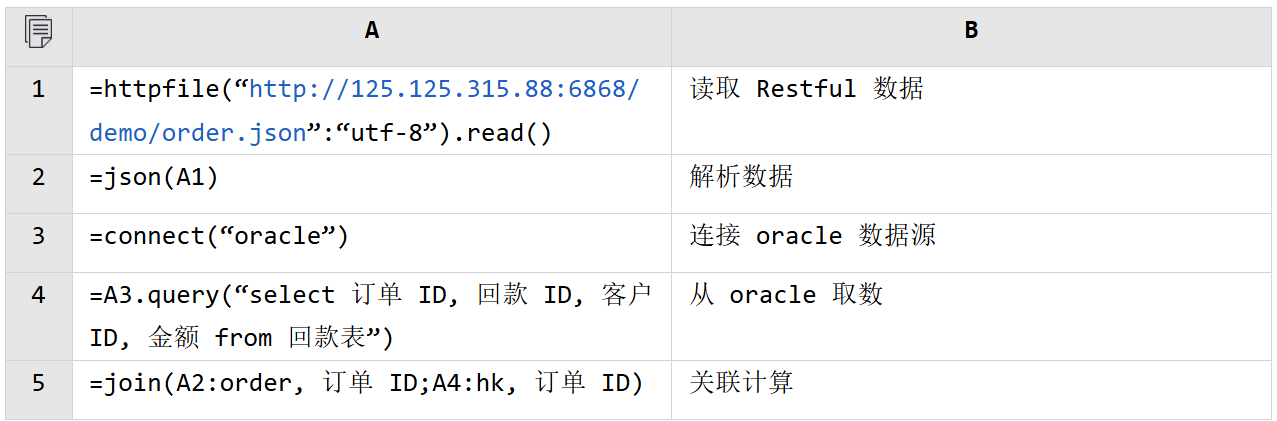报表的数据需要来自HTTP 的 JSON 数据和来自 ORACLE 数据的混算,如果用原始的方式,需要写很多 JAVA 代码才可以实现,而 SPL 五行就可以做完,而且这个难度的代码,初级人员学几天就可以上手,省出来的工作量是显而易见的。