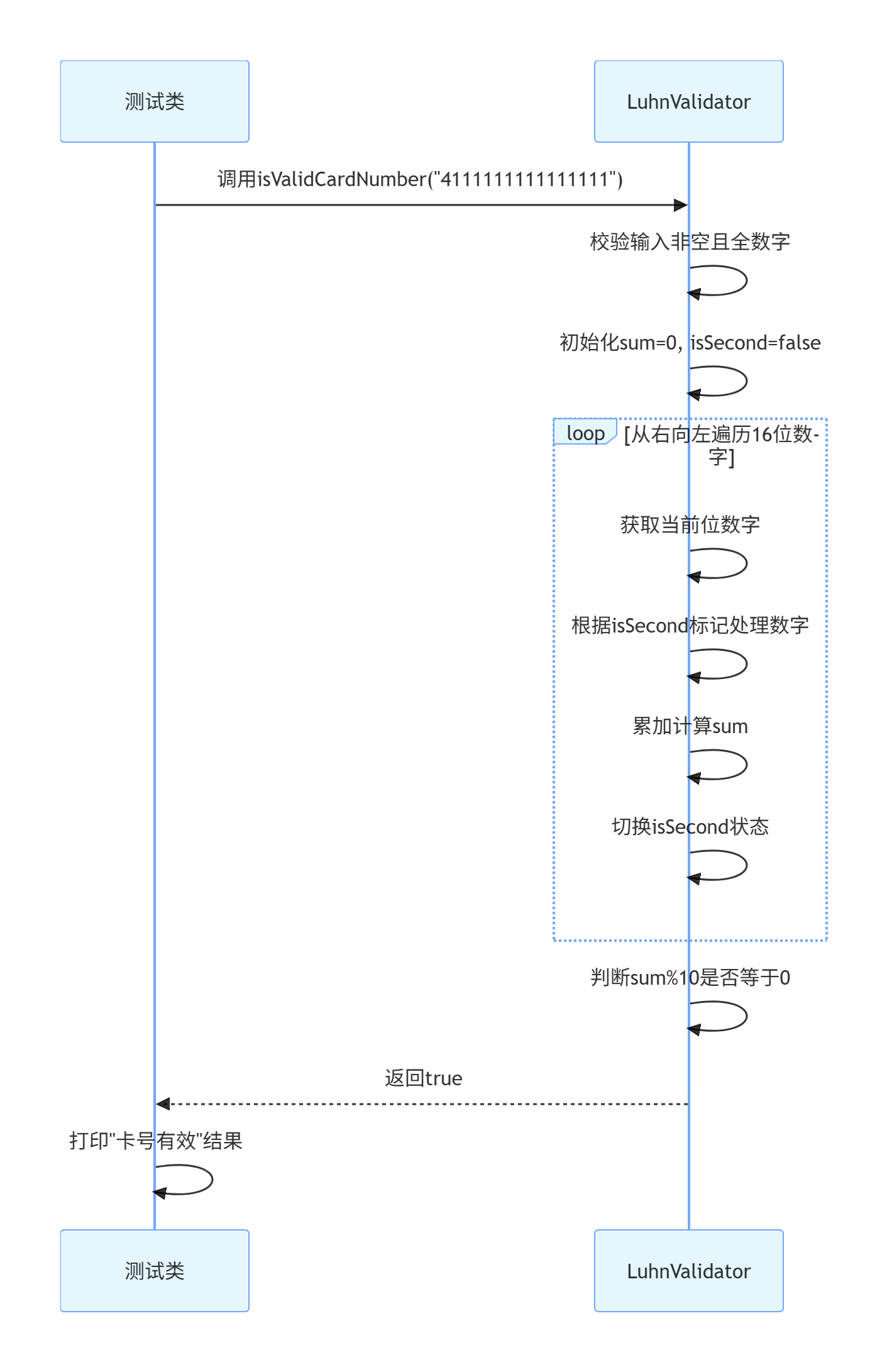 首先,我们需要定义一个方法来实现Luhn算法的校验逻辑。