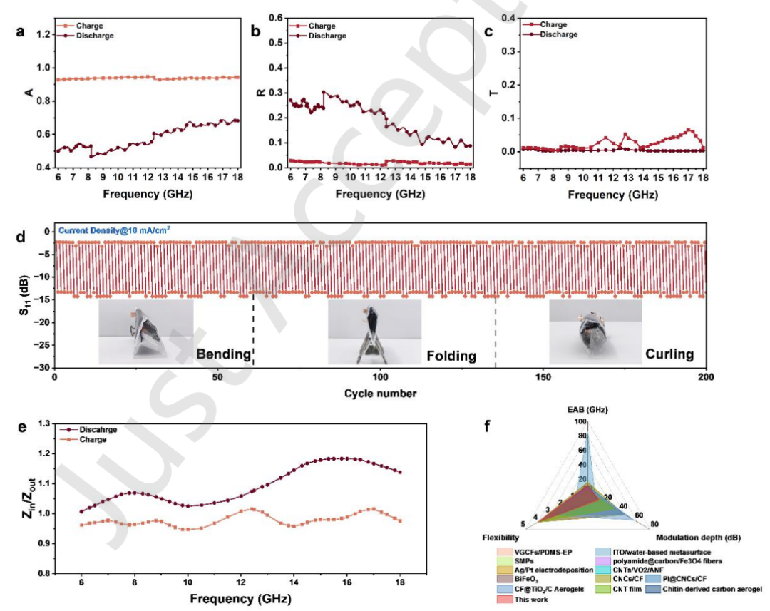 总之,本研究提出了一种基于电化学阻抗匹配调控的多层可调微波吸收策略,通过将锌空气电池与吸波结构耦合,利用充放电过程中氧气在界面的动态变化,实现了对阻抗匹配状态的实时、可逆调节。该机制避免了传统热控或机械调控的能耗高、响应慢等问题,兼具快速响应、低能耗和高集成度优势。所制备的柔性器件在宽频段(6–18 GHz)内表现出高达15 dB的调制深度,并在反复形变下保持性能稳定,展现出在下一代可穿戴电子、自适应集成电路、智能家居及雷达隐身等领域的应用潜力。未来可探索更多气体介质、电解质体系与结构设计,以进一步提升调制带宽、环境稳定性与多功能集成能力。