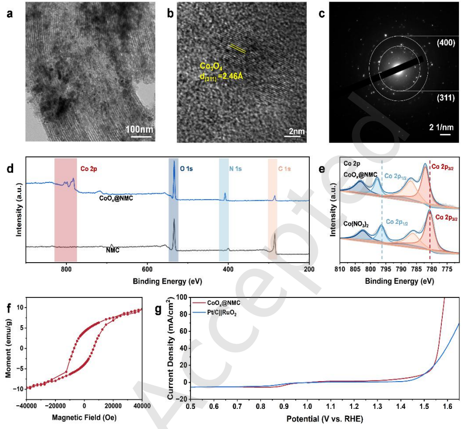 CoOx@NMC催化剂通过两步法制备,包括液相机械化学混合与随后的快速焦耳热处理(400°C,空气气氛,2分钟),该过程促使Co(NO3)₂前驱体转化为Co3O4相,并形成氮掺杂介孔碳支撑的簇状复合结构。HRTEM显示Co3O4晶格条纹(2.46 Å,对应(311)晶面),SAED进一步确认其晶体结构;XRD表明Co3O4与Co0相共存,证实焦耳加热过程中Co物种的受控氧化;XPS显示Co呈Co³⁺/Co²⁺混合价态,表面富含活性氧物种;M-H曲线证实其铁磁特性。该催化剂在碱性条件下表现出优异的ORR/OER双功能活性,其低Tafel斜率(60.3 mV dec⁻¹)和低过电位(357 mV@100 mA cm⁻²)为高效气泡生成与快速阻抗调节奠定了基础。