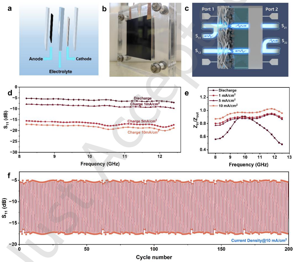 采用波导传输线法测试了基于ZAB器件的S参数与电磁性能。在不同电流密度下进行充放电测试,发现充电过程中气泡生成速率与电磁波吸收效率呈正相关。器件在12–18 GHz频段内实现最高12 dB的调制深度,并在6小时连续循环中保持稳定。尽管受限于器件厚度与支撑结构,其有效调制频宽受限,但验证了电化学调控微波吸收的可行性。