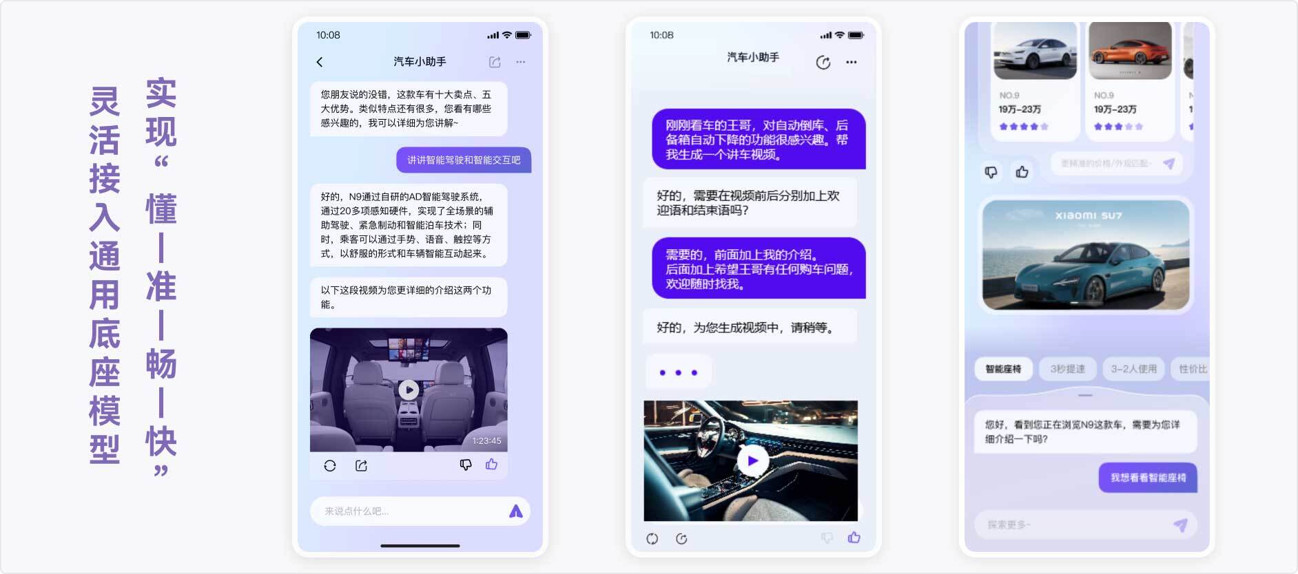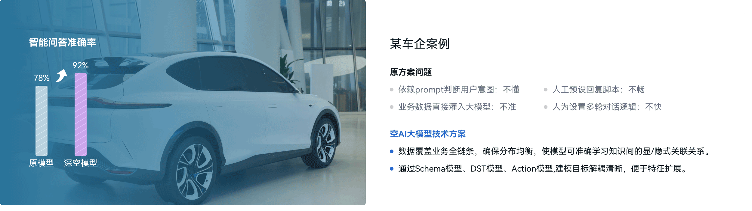 该项目以车企产品信息、用户交互数据作为模型数据,覆盖业务全链条,使模型可准确学习知识间的显/隐式关联关系。项目选用Schema模型、DST模型、Action模型,赋予基础大模型知识结构化、任务拆解和对话追踪的功能,突破通用大模型难以直接依赖prompt判断用户意图的局限,简化了人工预设回复脚本和人为设置对话逻辑的流程,服务于智能推荐、在线应答等人/人、人/机交互的业务场景。