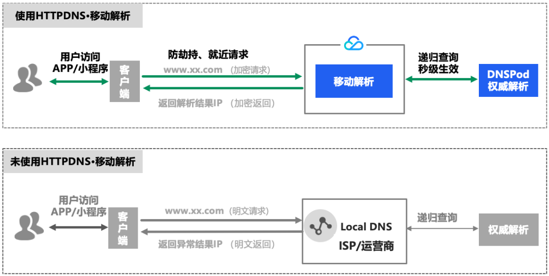 腾讯云移动解析HTTPDNS,是一款基于HTTP/HTTPS协议发起请求的域名解析服务,专为移动端APP及小程序打造。它不再走传统LocalDNS容易出问题的UDP端口,而是通过加密请求直接与腾讯云全球解析节点通信,实现更快速、更准确、更安全的解析响应。