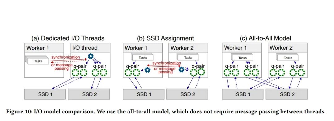 关系 | 提出了设计图8和图10所要解决的根本问题。 | 图8的架构要求图10的全对全模型。因为每个工作线程需要独立处理所有任务(包括I/O),所以必须采用允许直接访问所有SSD的模型。 | 图10的全对全模型是实现图8架构的关键技术支撑。它使得“工作线程负责一切”的设计能够高效、无冲突地执行。 |