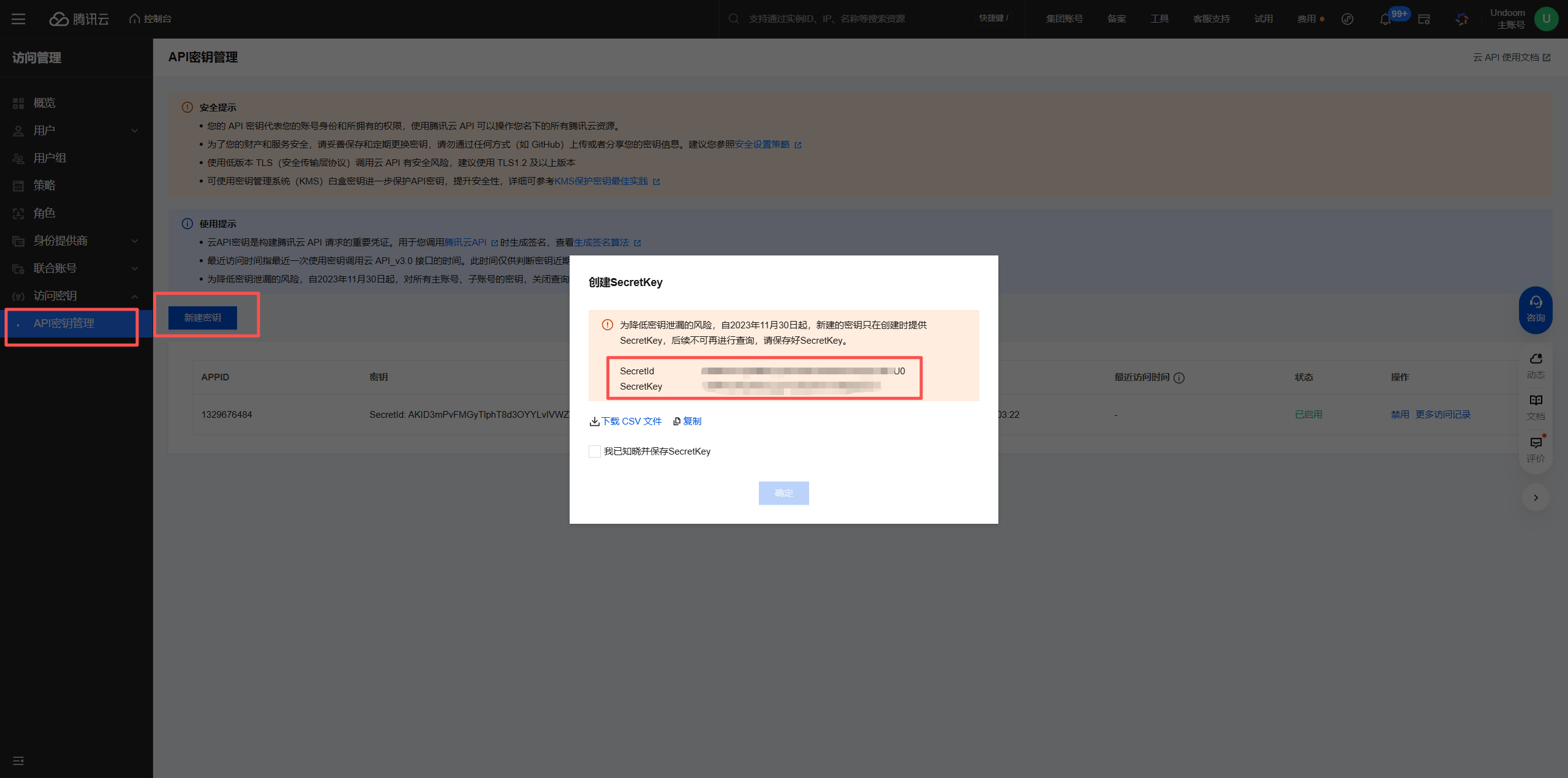 访问腾讯云控制台的 API 密钥管理页面。这是连接本地客户端与云端资源的数字通行证。
