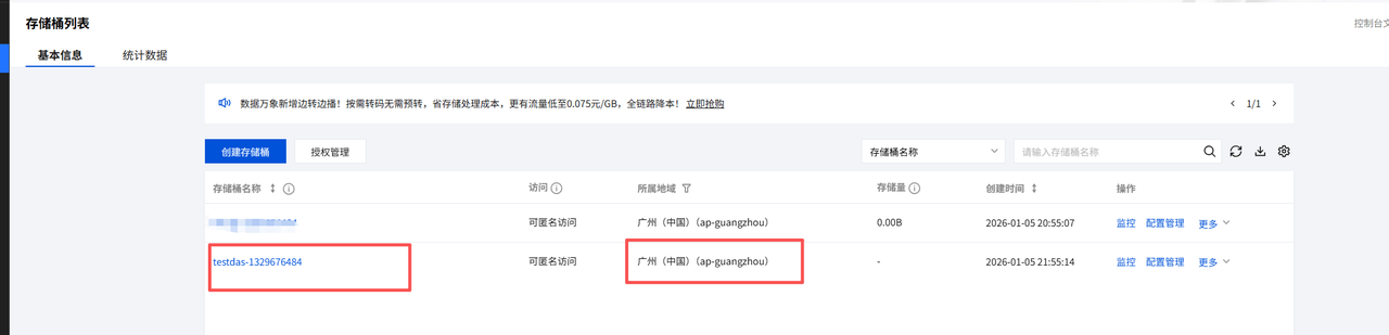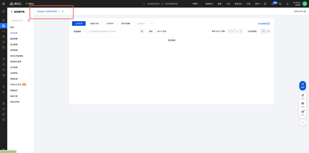进入存储桶详情页后,可以观察到桶的名称以及所属地域编号。地域编号(如 ap-guangzhou)是构建请求 URL 的关键组成部分,它决定了数据流向的具体物理机房。