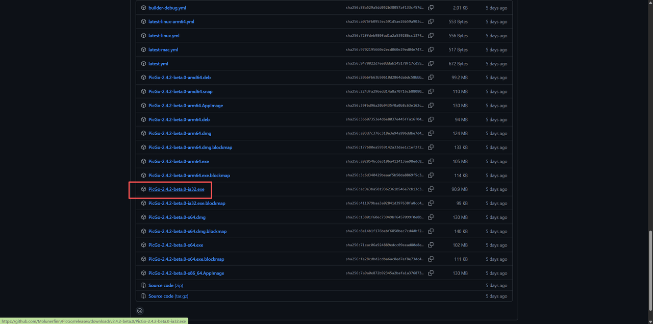https://github.com/Molunerfinn/PicGo/releases/tag/v2.4.2-beta.0根据 Windows 系统的架构选择对应的安装程序。安装完成后,PicGo 会在系统后台运行一个监听端口,等待来自其他应用程序的上传请求。