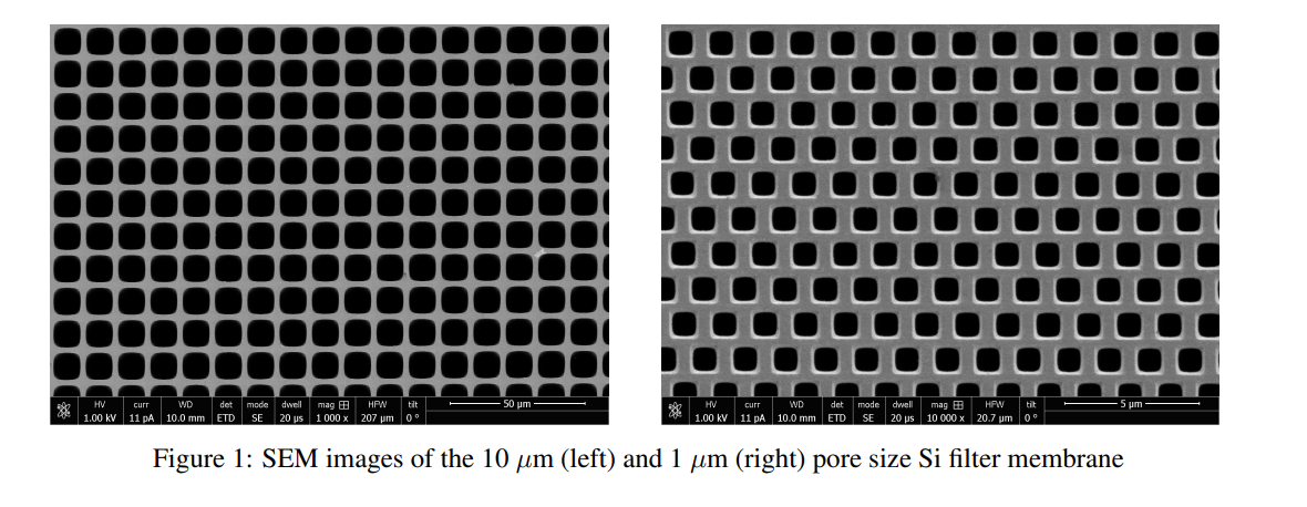 基底与过滤器。 所有过滤实验使用的基底是由SmartMembranes GmbH(德国)通过化学蚀刻生产的标称孔径为1 µm的硅(Si)滤膜。这些膜被激光切割成直径9 mm、厚度约300 µm的圆形。每个膜都具有方形孔结构,旨在有效过滤微米和纳米颗粒。