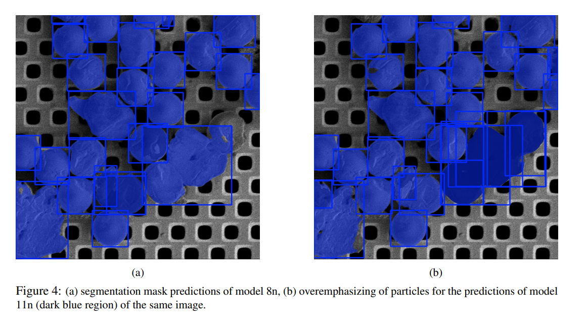 总体而言,YOLO 8n和YOLO 11n模型在测试数据上似乎都表现良好。与8n模型相比,11n模型倾向于过度关注某些区域,并将较大的物体分割成较小的部分,如图4a所示。另一方面,对于存在颗粒重叠或大量颗粒聚集在狭小空间的图像,11n模型具有更好的召回率,图5展示了一个例子。总体而言,11n模型还存在分割掩模不准确的问题,并且容易遗漏颗粒的细小部分,这些遗漏在所有图像中累积起来。但它遗漏的部分常常与8n模型遗漏的部分不同,因此没有明显的趋势可见。