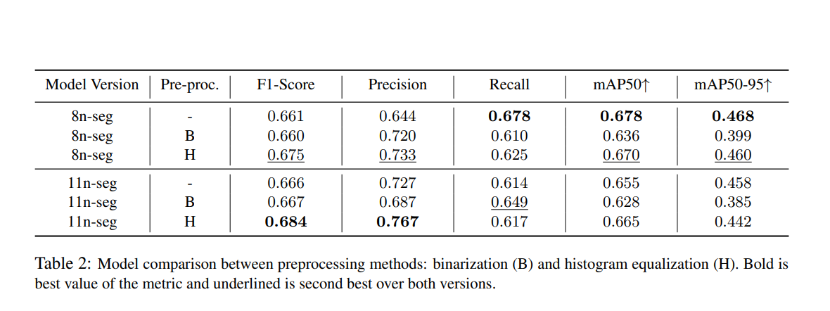 表2:预处理方法之间的模型比较:二值化(B)和直方图均衡化(H)。加粗表示两个版本中该指标的最佳值,下划线表示次佳值。