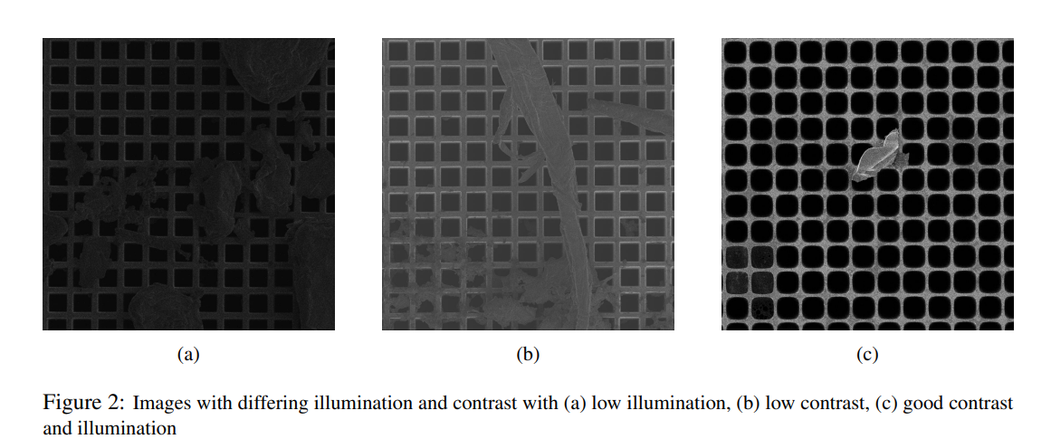 标记。 手动标注了195张获取的图像,以指示微塑料颗粒和纤维。为支持这项专家驱动的任务,使用了软件 makesense.ai [29]。在使用YOLOv8进行初始训练运行后,对模型预测的额外分割掩模进行了必要的校正,并将其也保留为真实值(ground truth)。 裁剪。 为了更顺利地进行YOLO模型训练,对称的数据格式更有利。为此,将所有图像裁剪为1024x1024(2的幂次方)的尺寸,以避免模型的不均匀填充。 样本选择。 标记后,从图像中移除了长度或宽度小于相应过滤器孔径对角线60%的颗粒,以防止模型偏向于:第一,图像中的微小扰动;第二,本应在过滤器级联中更晚阶段检测到的小颗粒。由于图像的缩放因子略有不同(推测是由于拍摄图像时过滤器的轻微倾斜所致),通过经典计算机视觉方法实现了过滤器孔的检测。首先对图像应用阈值处理,然后进行反色,之后确定合理尺寸的过滤器孔的连通分量。最后,将最频繁出现的连通分量大小作为过滤器孔径的参考。没有分割掩模剩余的图像从数据集中移除,因此每张图像至少有一个标记颗粒。经过最终手动过滤以移除带有过多未标记颗粒的图像后,剩下152张图像,总计1184个颗粒。结果产生了以下过滤器类型分布:Si滤膜 1µm:58张图像,Si滤膜 10µm:36张图像,Crate过滤器直型:26张图像,Crate过滤器斜型:32张图像。 对比度校正。 获取的原始数据显示出彼此之间存在多种对比度和照明差异(参见图2)。基于在此条件下进行目标检测对人类检测者具有挑战性的观察,分别测试了两种现有的预处理方法作为应对措施: