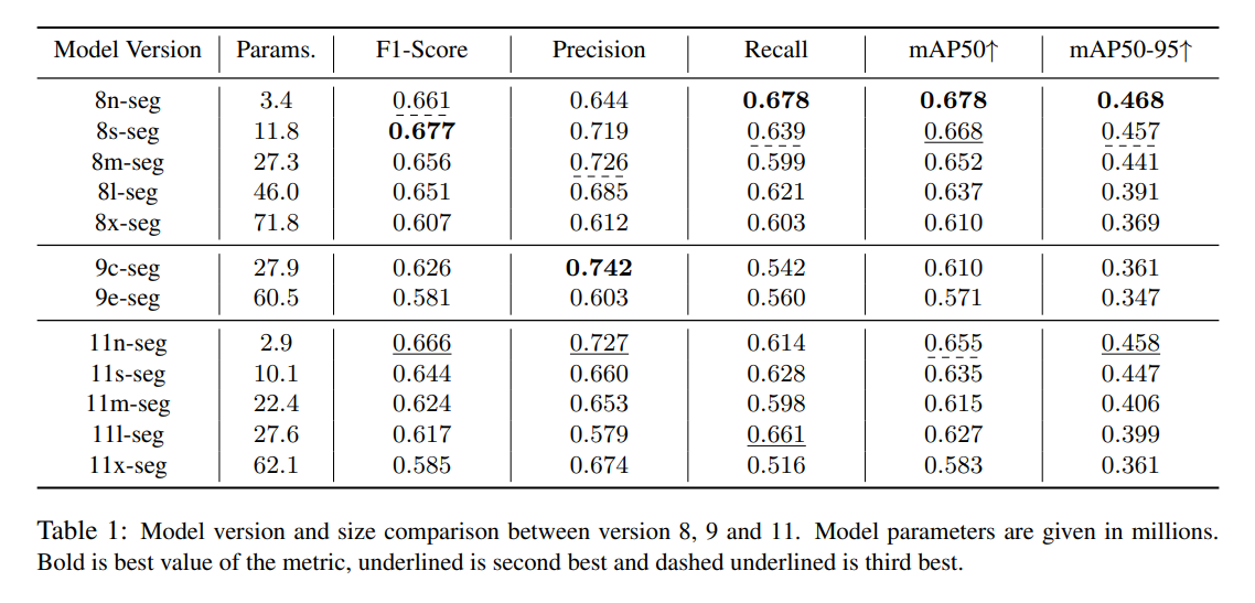 表1显示了版本和规模的比较结果。总体而言,除了精确度指标外,版本8n表现最佳,紧随其后的是版本8s和11n——这两个版本在精确度方面表现更好,仅在两个mAP分数上略有不足,但在召回率方面落后。版本9c在精确度上表现最佳,但与大多数其他变体相比,其在分割掩模重叠的精度(即mAP分数)和召回率方面明显不足。总的来说,较小规模的模型变体在其F1分数方面表现更好。对于版本8,中等规模变体的精确度有所提高,但只有版本8s的改进足够显著,并且召回率下降的代价足够小,以至于其F1分数超过了8n版本。对于版本9和11,随着参数规模增大,召回率仅有轻微改善。这两个版本的所有其他参数都随着模型规模增大而下降,但有一个例外是11l,其召回率显著高于版本11的所有其他变体,但代价是其精确度是所有变体中最差的。表1:版本8、9和11之间的模型版本与规模比较。模型参数以百万计。加粗表示该指标最佳值,下划线表示次佳值,虚线下划线表示第三佳值。