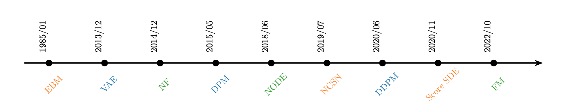 该文件详尽地追溯了扩散模型的三个主要思想起源。这三种视角在历史上各自独立发展,分别解决了生成模型在不同方面的挑战,但最终都指向了一个共同的数学结构。