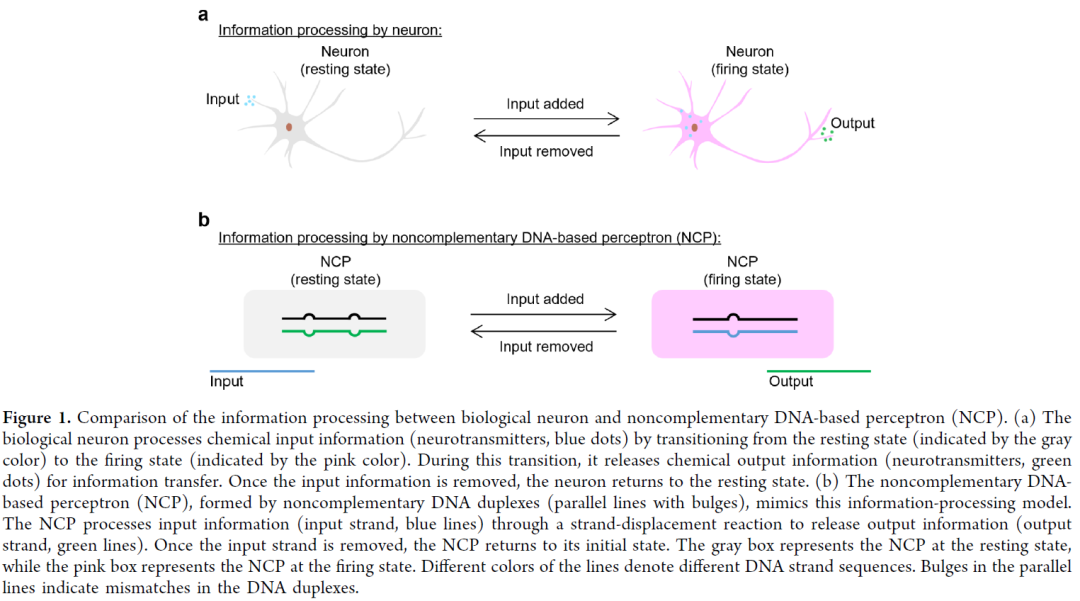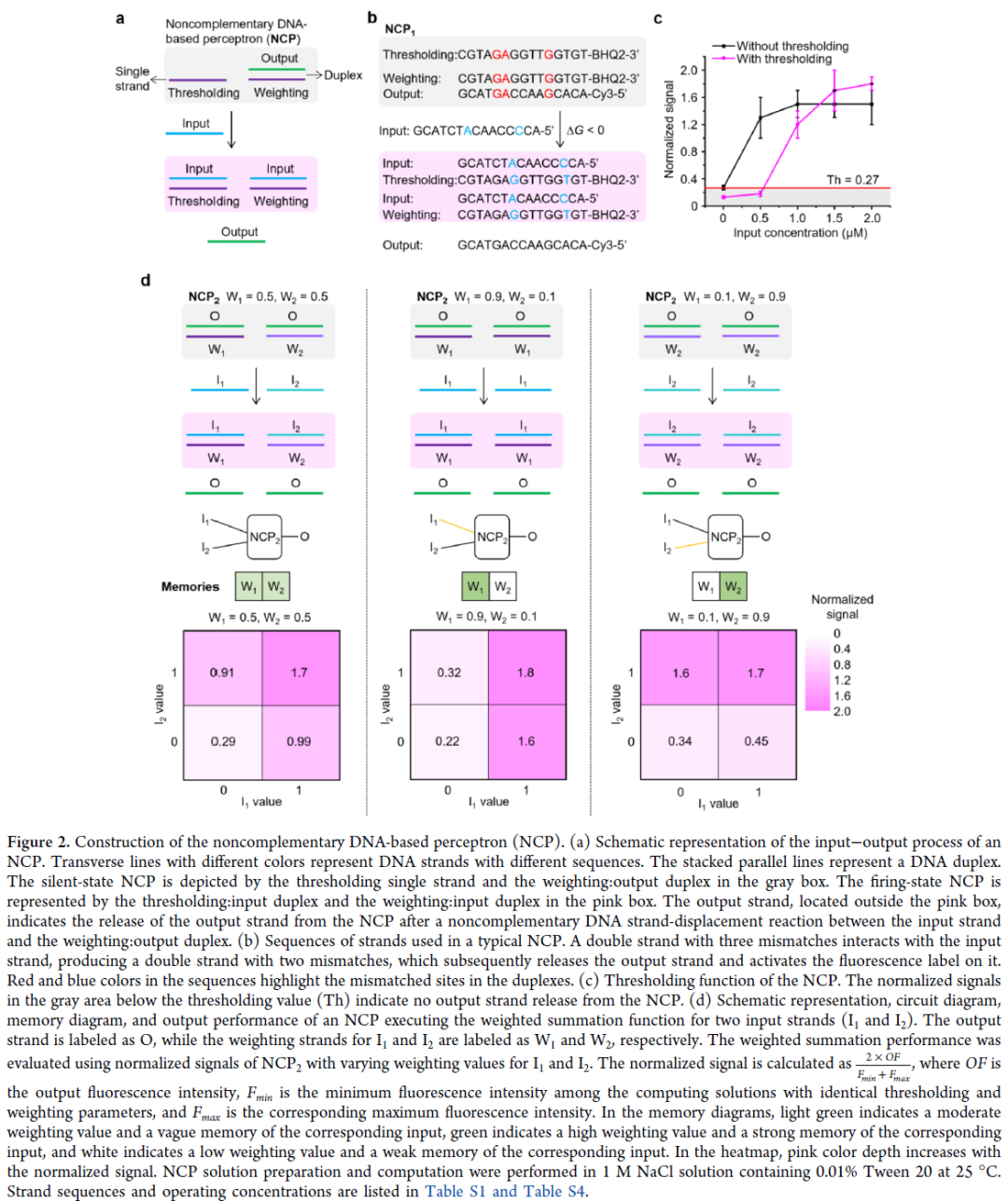研究人员将非互补 DNA 双链作为 NCP 的基本单元,利用链置换模拟生物神经元的输入-输出过程,并在移除输入链后自发复原,实现可重复使用。NCP 包含阈值链(用于判断输入强度)与权重双链(用于调节输出强度),可执行类神经元的阈值和加权求和功能。