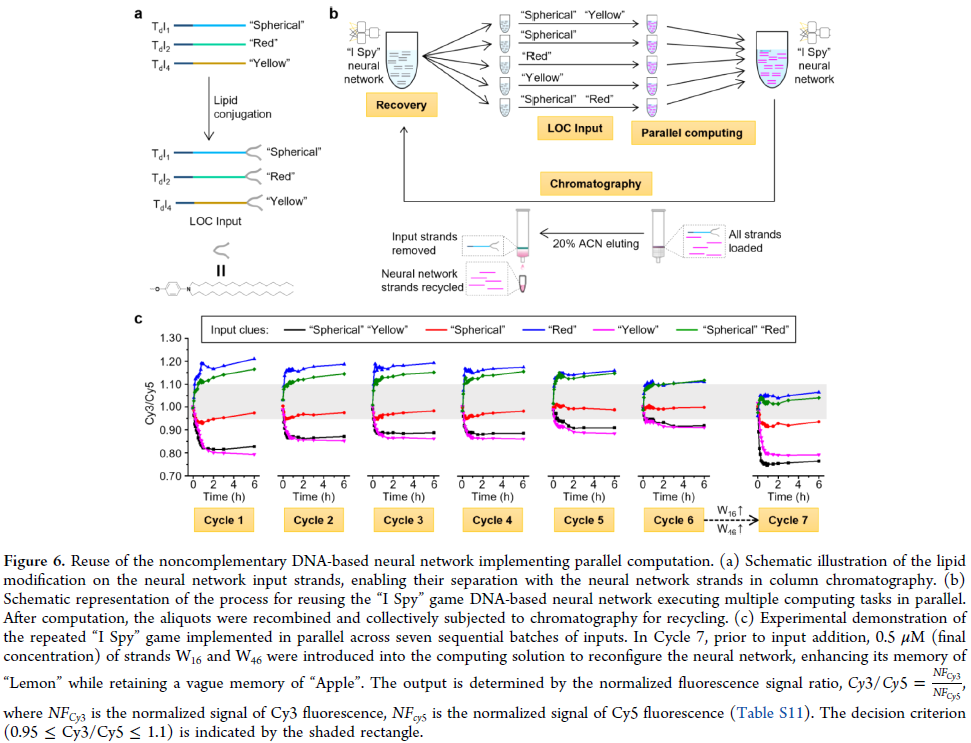 研究人员提出利用脂质修饰输入链(LOC)降低极性,通过反相柱色谱从体系中移除输入链,实现神经网络的复用。脂质修饰不影响逻辑门性能。在 4 位模式识别网络中,系统在多轮“I Spy”游戏中保持高准确率,并支持一次性并行处理多个任务。