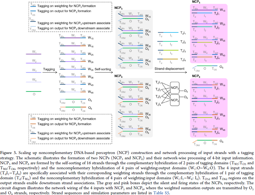 为解决规模化构建中序列设计复杂、杂交特异性差的问题,研究人员引入标签域(tagging domain),通过可控互补配对实现高特异性、多 NCP 并行组装。利用该策略,构建了能同时处理 4 位输入信息的 NCP 网络,并在模拟中实现输入模式分类。