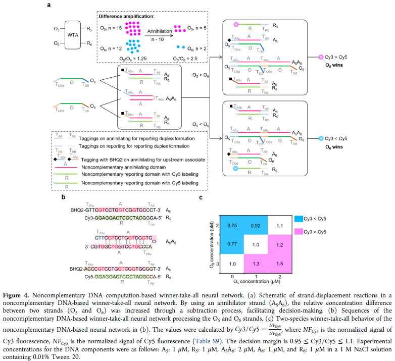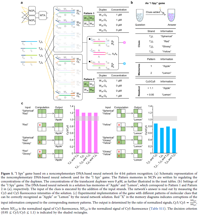 研究人员提出了一种前所未有的非互补 DNA 感知机(NCP)计算策略,首次实现了可重复使用的 DNA 基神经网络。研究设计了一种“标签化”策略以便于规模化构建非互补神经网络。4 位分子模式识别可通过 4 条输入链与 4 对非互补 DNA 双链的链置换反应实现,双链浓度调控权重值。进一步结合非互补“胜者为王”模块实现决策功能,并通过“I Spy”游戏任务展示应用。最重要的是,利用可移除输入链(脂质-寡核苷酸偶联物),该 NCP 网络可在多个计算周期中稳定运行,解决了 DNA 基神经网络的可重复使用难题。这项工作为具备学习能力的分子计算系统提供了可行路径。