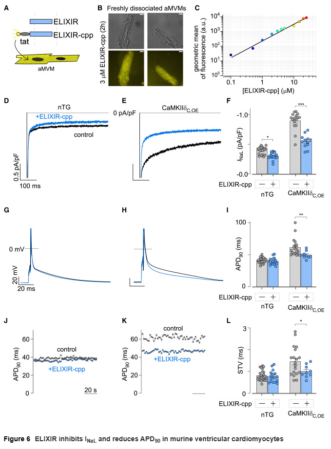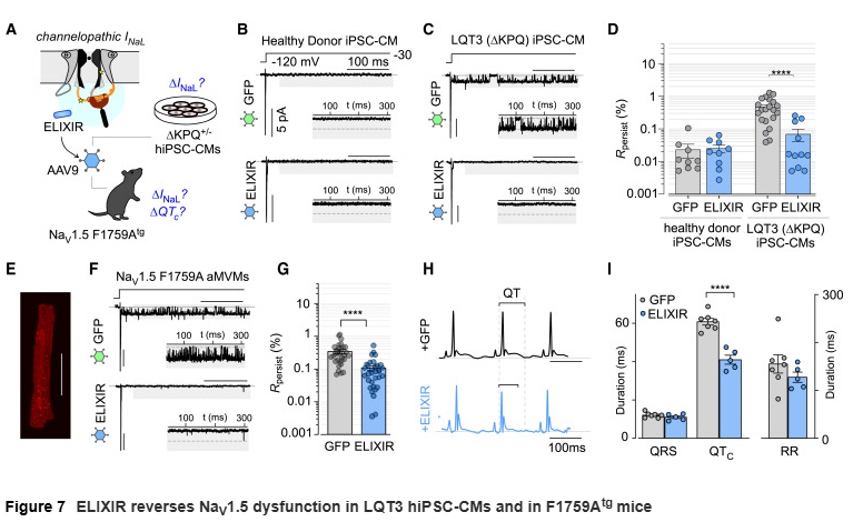 在心脏CaMKIIδC过表达的小鼠模型中,心室肌细胞的INaL升高并伴随动作电位延长。ELIXIR进入细胞后显著降低了INaL,并缩短了动作电位时程和短期变异性,恢复至接近正常水平。此外,在来源于LQT3患者的iPSC心肌细胞以及携带NaV1.5 F1759A突变的转基因小鼠中,ELIXIR同样表现出明显的疗效,缩短QT间期并抑制异常钠电流。