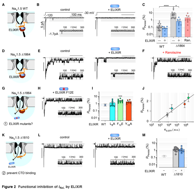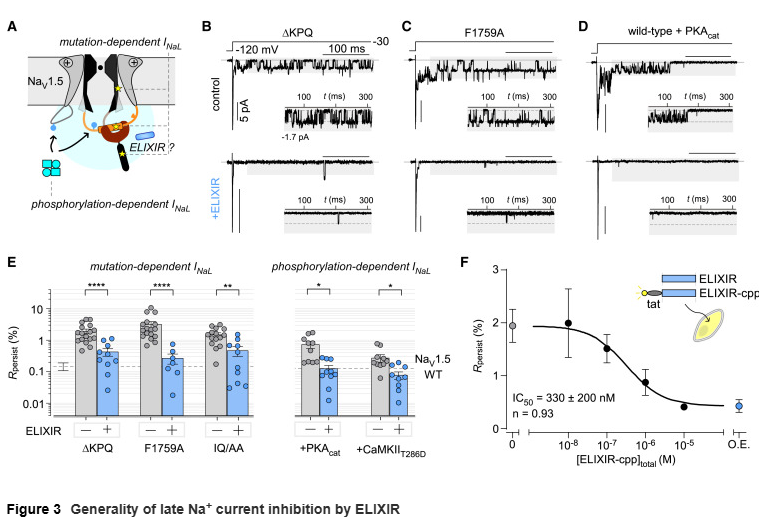 在表达NaV1.5突变体(如Δ1864)的细胞中,ELIXIR显著降低了异常升高的INaL(>12倍),而对野生型NaV1.5几乎无影响。对多个病理性突变(ΔKPQ、F1759A、IQ/AA)以及由蛋白激酶PKA或CaMKII介导的磷酸化修饰所致的INaL,ELIXIR均表现出广谱抑制作用。这表明其能够针对多种致病机制下的钠电流异常。