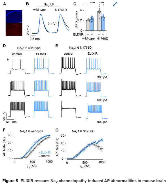 在表达NaV1.6 N1768D突变的小鼠模型中,神经元表现出动作电位时程延长、去极化阻滞等异常。AAV9递送的ELIXIR显著改善了这些病理表型,缩短了动作电位时程,并减轻了去极化阻滞,从而部分恢复了神经元的正常兴奋性。