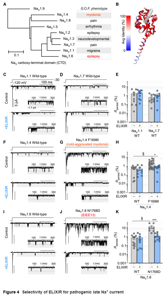 尽管ELIXIR能够与NaV1.1–1.9的CTD结构域结合,但其对野生型通道几乎无效,却能有效抑制功能获得性突变导致的病理性INaL。例如,在与先天性肌强直相关的NaV1.4 F1698I突变体和与癫痫相关的NaV1.6 N1768D突变体中,ELIXIR均显著降低了INaL,且恢复至接近正常水平。这说明ELIXIR在多种组织和疾病环境下具有潜在应用。