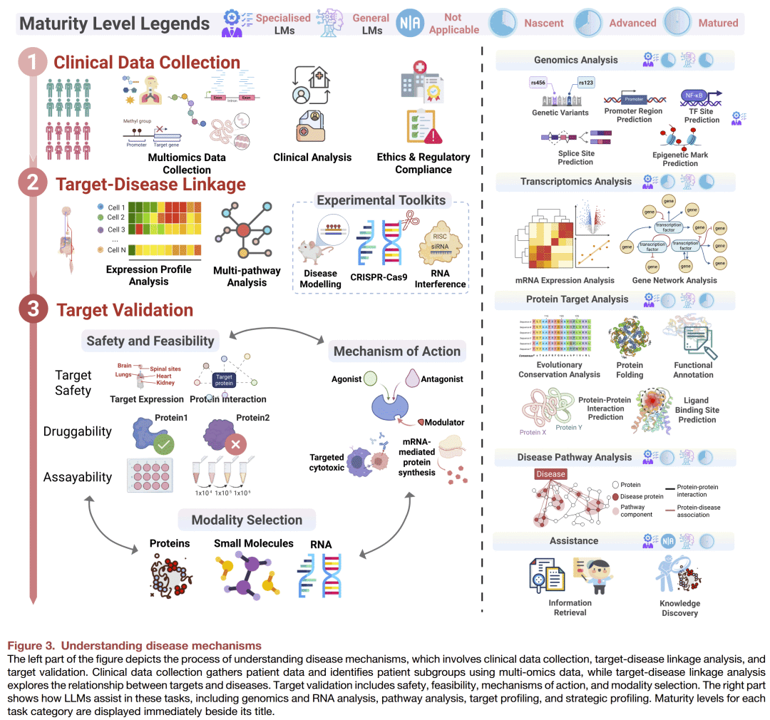 理解疾病机制是药物发现的首要步骤,其主要目标是识别适合的药物靶点。该过程通常包括三个主要阶段(图3):临床数据收集、靶点-疾病关联分析以及靶点验证。