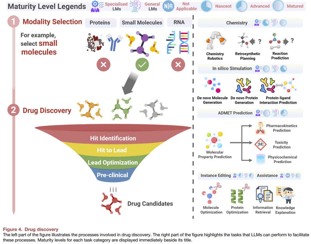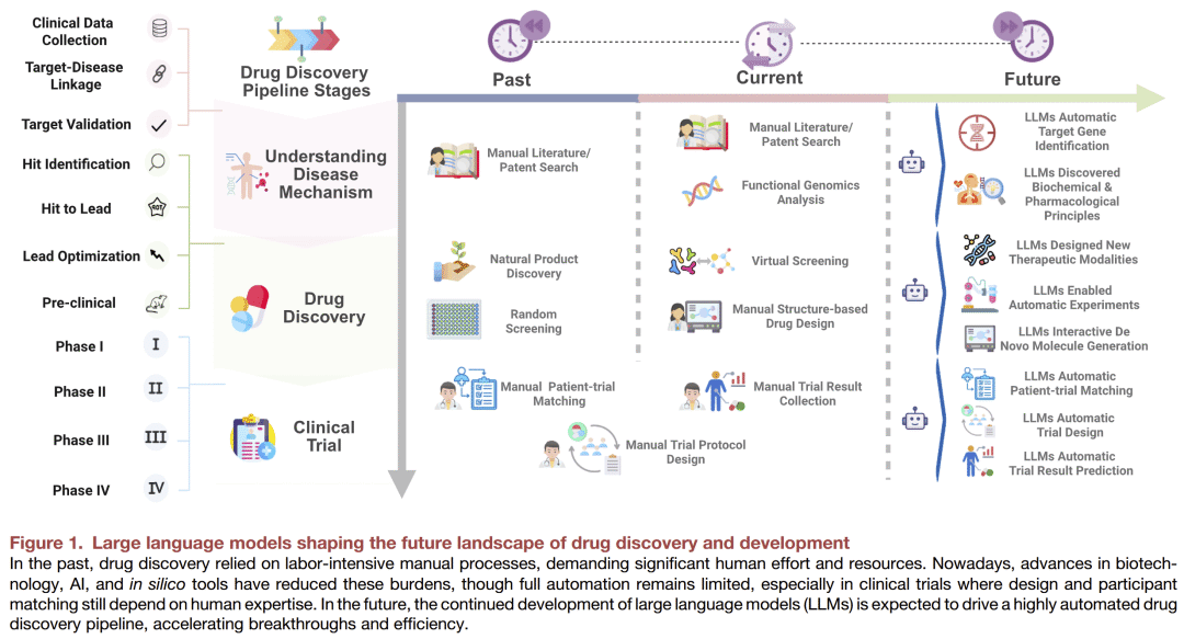 大型语言模型正在深刻改变药物发现与开发的格局。研究人员综述了其在疾病机制解析、分子生成与优化、临床试验加速等环节的应用,并提出了对未来发展的展望。总体来看: