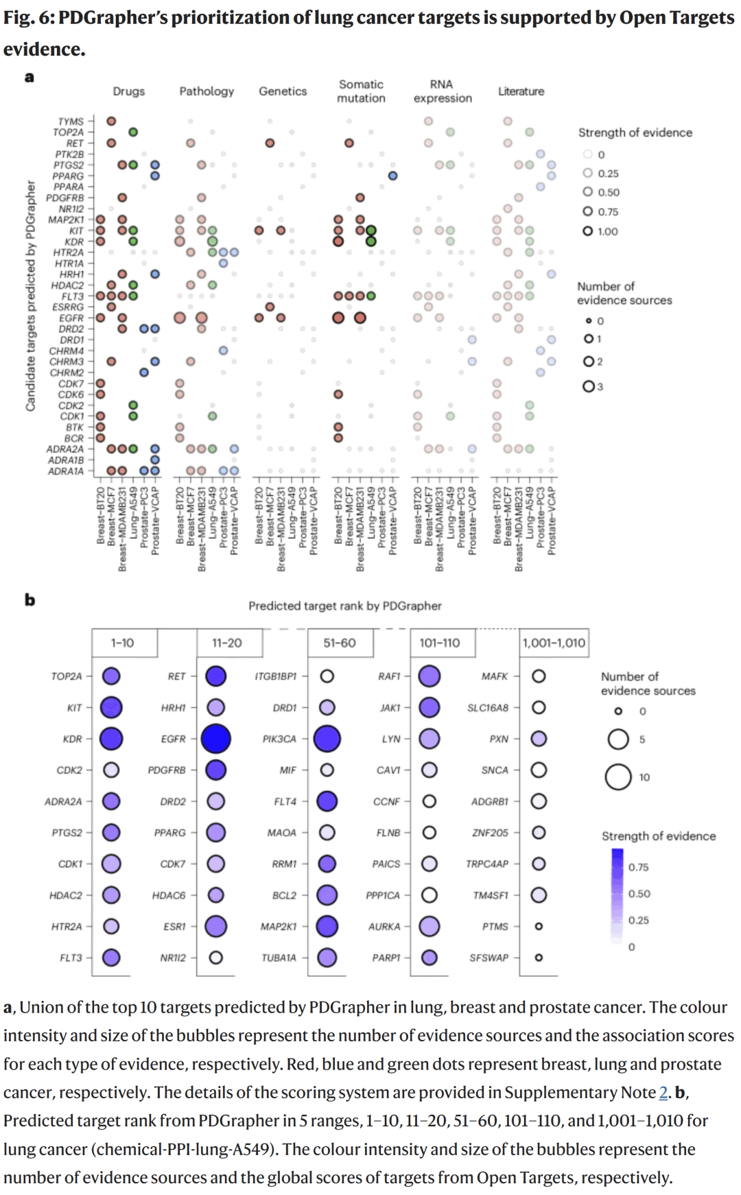PDGrapher 还能够识别临床和生物学上已有证据支持的治疗靶点。例如,在肺癌数据中,模型成功预测了 VEGFR2(KDR)作为潜在关键靶点,并关联到索拉非尼、凡德他尼等抗癌药物。进一步的案例研究表明,PDGrapher 预测的高排名基因更可能得到外部数据库(如 Open Targets)的支持,验证了模型预测的可靠性。