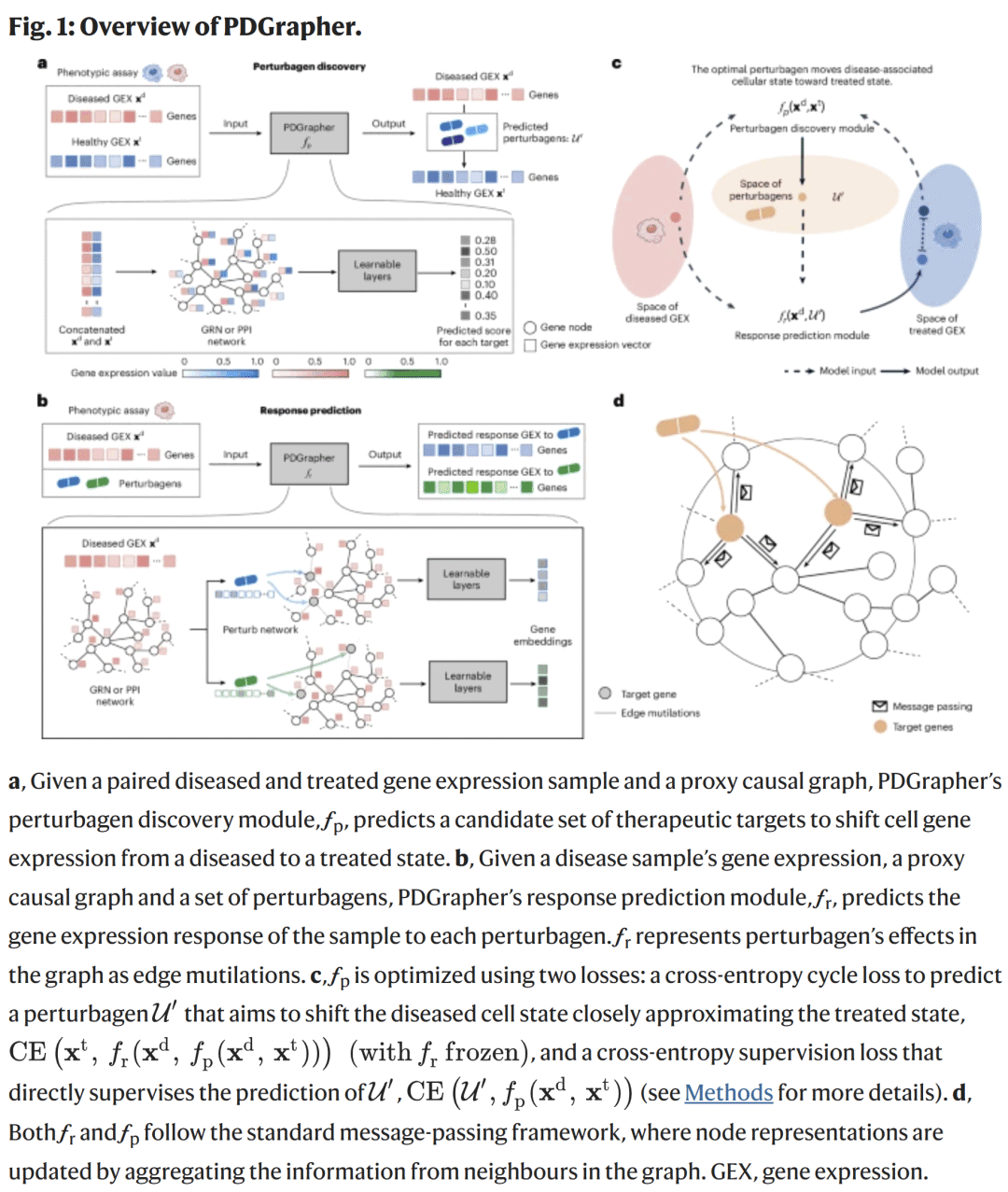PDGrapher 的目标是预测一组基因靶点,使得细胞从疾病状态转变为治疗状态。它由两个模块组成: