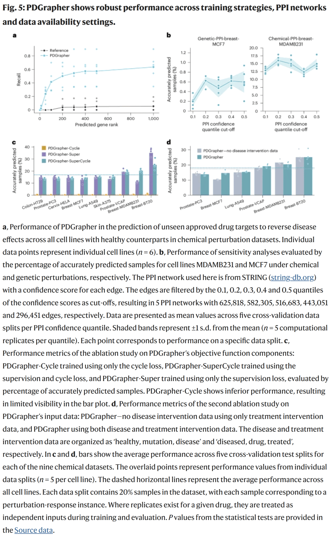 本研究提出的 PDGrapher 模型,将因果推理与图神经网络结合,直接预测能够逆转疾病表型的靶点组合。这一方法不仅在化学和基因干预数据中优于现有模型,还展示了显著的计算效率和良好的泛化能力。通过结合临床与生物学证据的验证,PDGrapher 在药物发现中的潜力得到进一步印证。