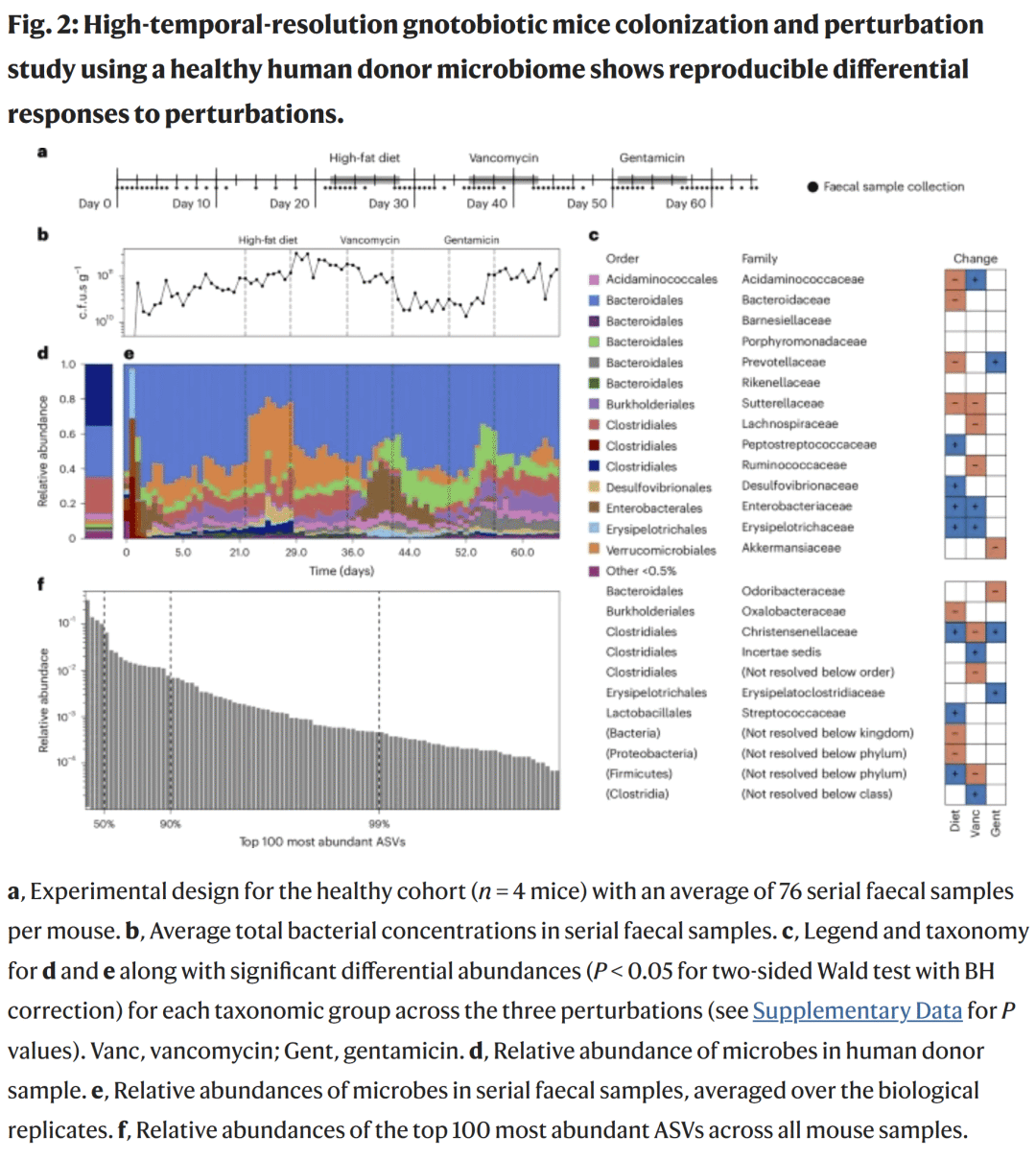 研究人员设计了两组“人源化”无菌小鼠实验:一组移植健康供体粪便,另一组移植溃疡性结肠炎患者粪便。稳定三周后,小鼠依次接受高脂饮食、万古霉素和庆大霉素处理,持续采集粪便样本达 65 天,总计 686 个样本,获得了高质量的 ASV 时间序列数据。这些数据为 MDSINE2 的推断提供了理想的扰动和时间分辨率。