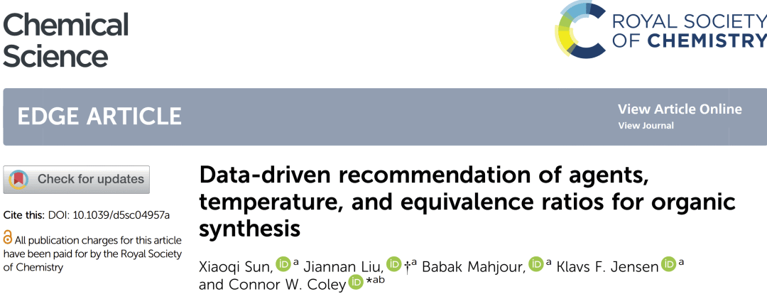 Sun, Xiaoqi, Jiannan Liu, Babak Mahjour, Klavs F. Jensen, and Connor W. Coley. "Data-driven recommendation of agents, temperature, and equivalence ratios for organic synthesis." Chemical Science (2025).