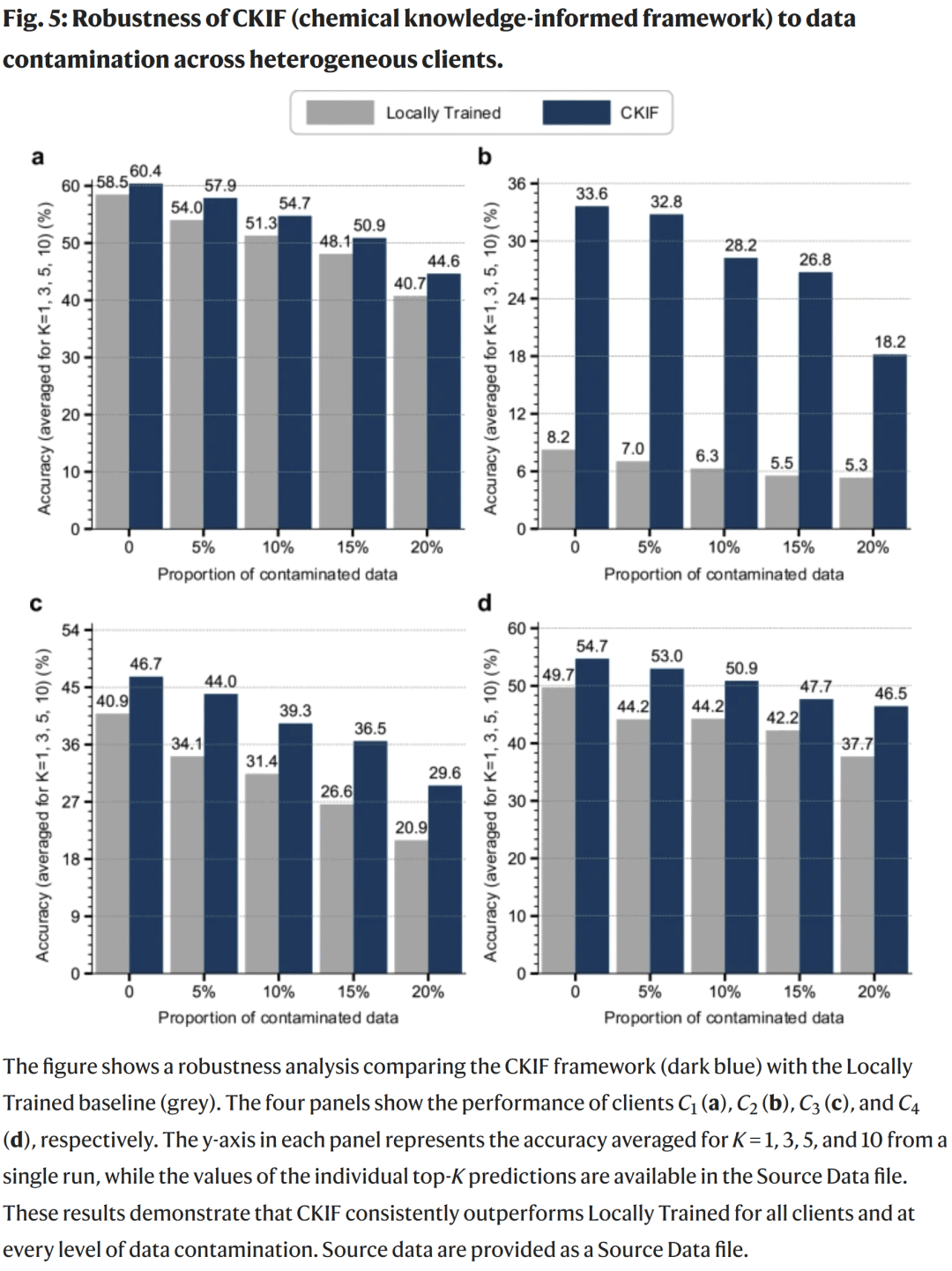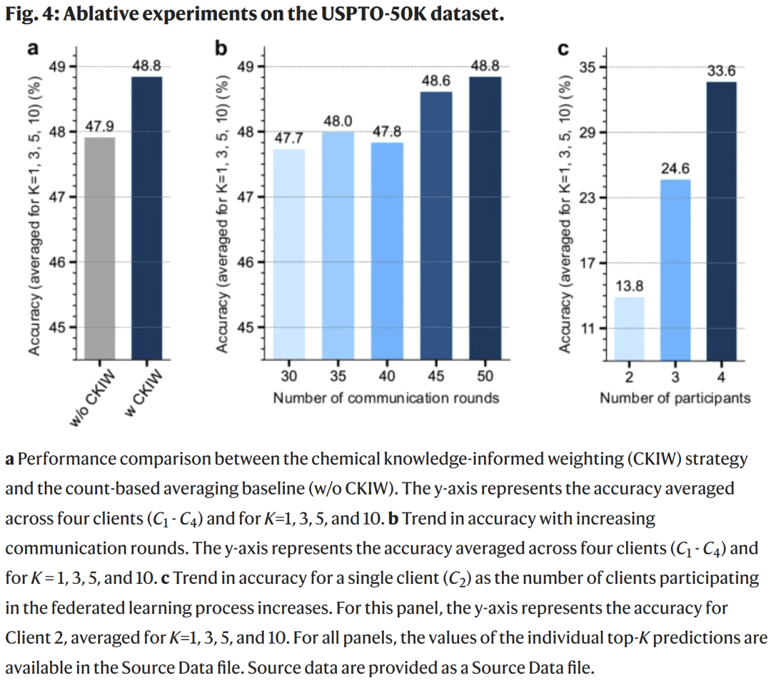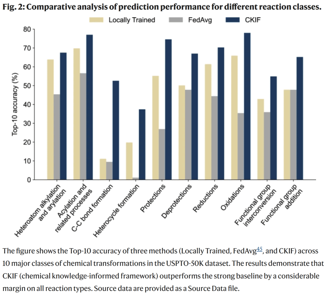 这一方法为药物化学和有机合成的协同研究提供了新思路,使得不同机构能够在保护数据隐私的同时共享模型收益。未来的改进方向包括:进一步扩展化学知识库的覆盖范围、结合图神经网络等更强的分子建模方法,以及探索跨模态的整合策略。整体来看,该框架在推动隐私保护下的化学智能化研究中具有重要意义。