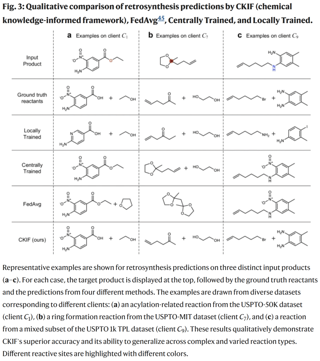 在模型中引入反应模板、价键守恒、化学合理性约束等知识规则,显著提升了预测的化学可行性。与仅依赖数据驱动的隐私保护模型相比,该方法在预测路径的正确性和可解释性上有明显优势。