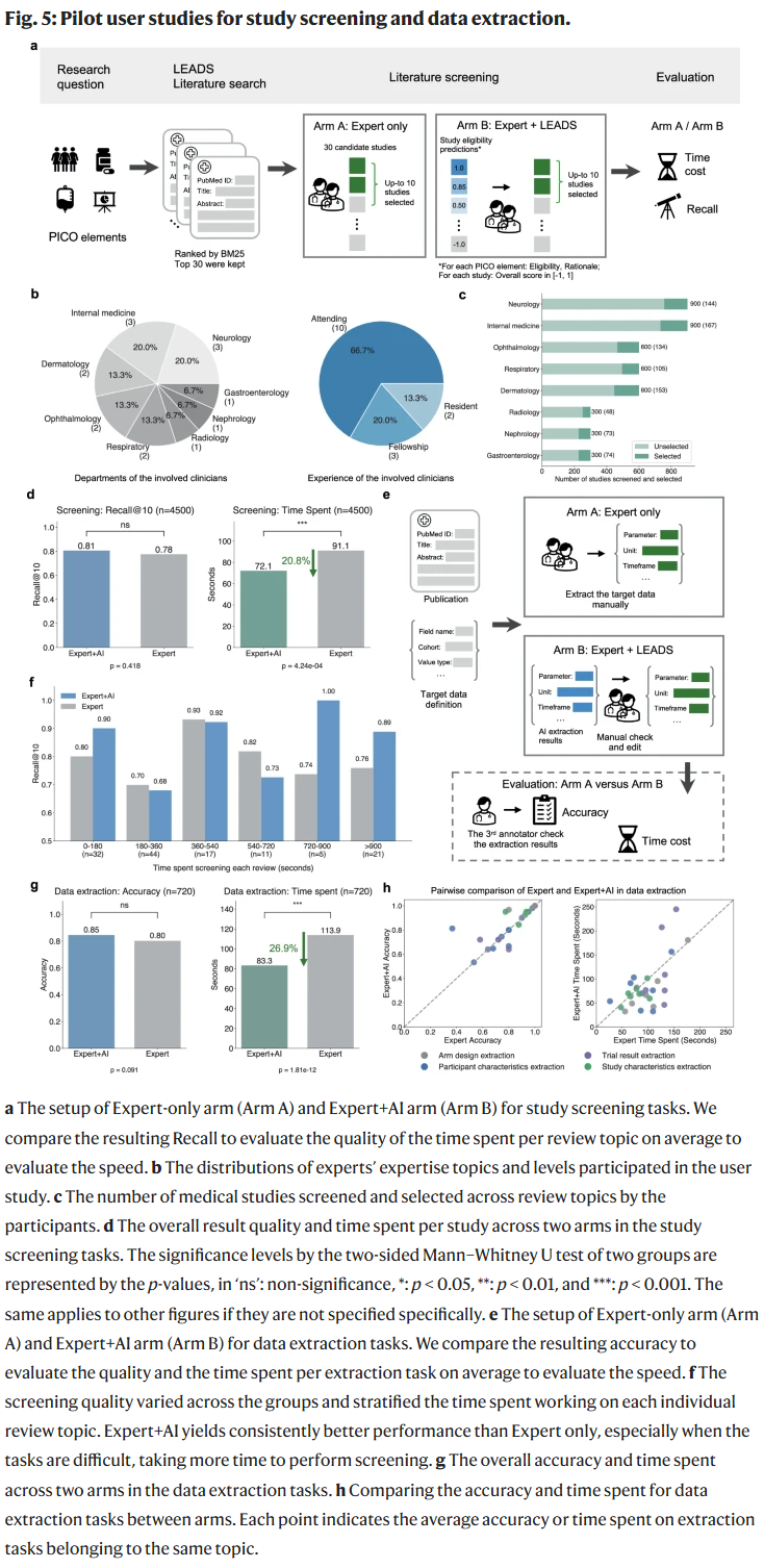在循证医学中,系统性文献综述是核心环节,但人工执行往往耗时长、成本高。研究人员提出了一个名为 LEADS 的人工智能基础模型,利用21,335项系统综述、453,625篇临床试验文献和27,015条临床试验注册信息构建的63万余条指令数据进行训练。与多种前沿大语言模型相比,LEADS在六大医学文献挖掘任务(研究检索、文献筛选、数据提取等)中均表现更优。在一项涉及16名临床医生和研究人员的用户研究中,LEADS帮助提高了召回率并节省了20%以上的时间,同时提升了数据提取的准确性。这说明在医学文献挖掘中,结合高质量领域数据训练的专业模型能显著增强研究人员的效率与成果可靠性。