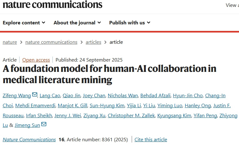 Wang, Z., Cao, L., Jin, Q. et al. A foundation model for human-AI collaboration in medical literature mining. Nat Commun 16, 8361 (2025).