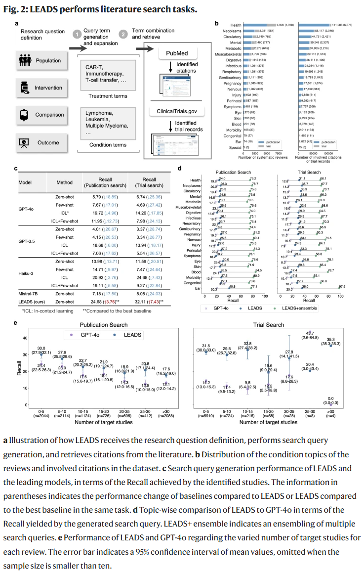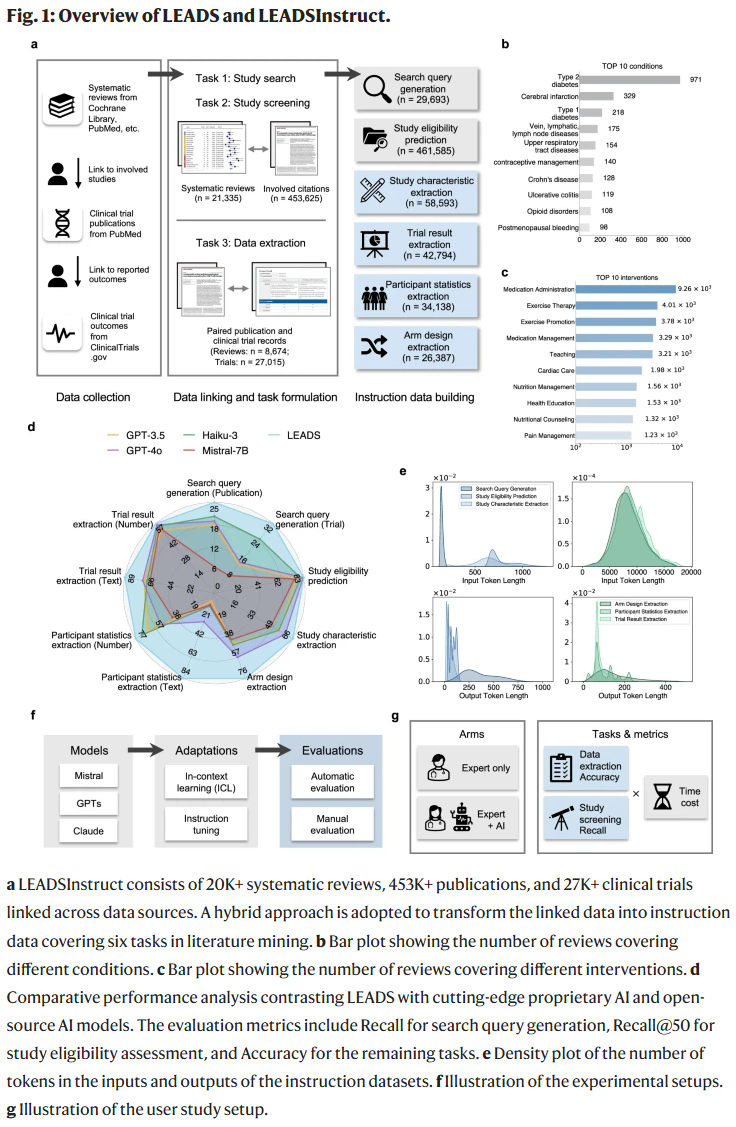 训练集来源于大规模系统综述、临床试验登记与相关文献的链接信息,最终形成63万余条高质量指令数据。LEADS在Mistral-7B模型基础上完成微调,具备长文本处理能力,可在无需额外训练的情况下跨疾病领域执行多任务。