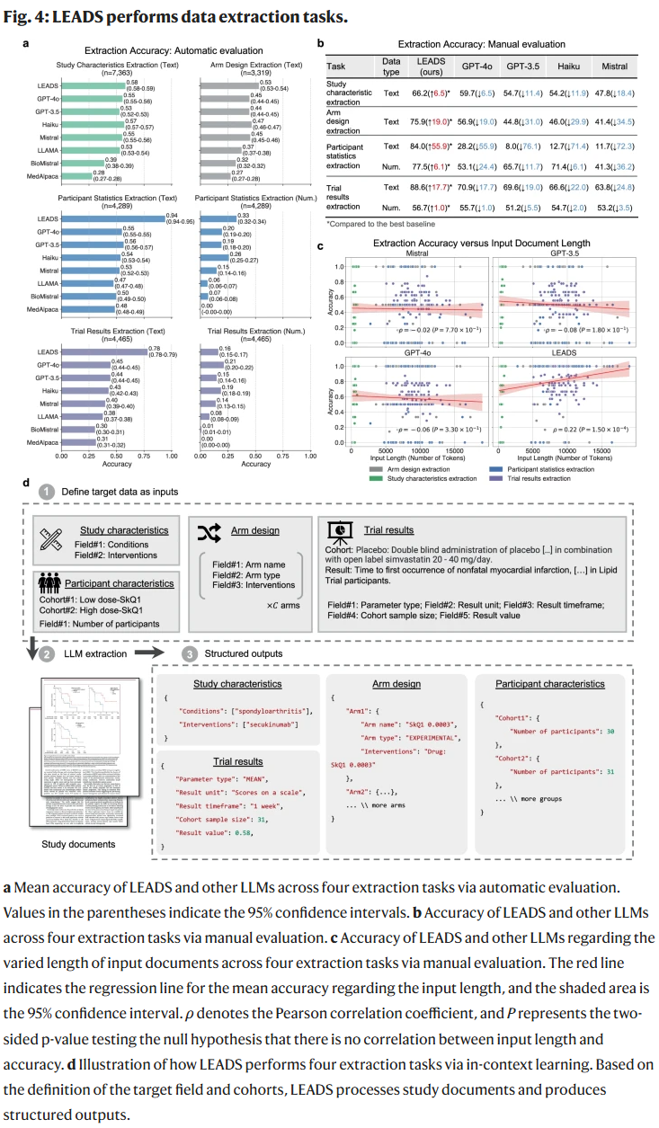LEADS在四类数据提取任务(研究特征、研究组设计、受试者统计、试验结果)中全面超越基线。尤其在受试者统计提取中,准确率显著高于GPT-4o。人工校验也证实,LEADS在多个任务上比其他模型提高了10%以上的准确度,同时在长文本输入下依然保持性能。