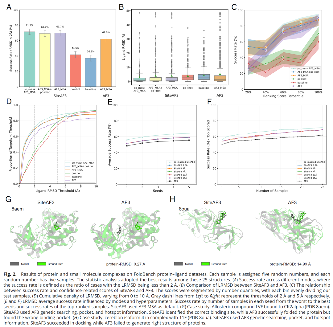 在 FoldBench 与 PoseBustersV2 数据集上,SiteAF3 的成功率分别为 71.6% 与 81.2%,均显著高于 AF3(62.0% 和 73.1%)。模型在五种配置模式下进行比较,其中“pocket-masked AF3 MSA”模式表现最佳,平均 LRMSD 降低 30%以上。在变构配体(allosteric ligands)预测中,SiteAF3 准确识别了 CK2α–LVF 等变构结合位点,而 AF3 将其错误定位至正构口袋。此外,SiteAF3 对孤儿蛋白和含辅因子体系同样表现出更高鲁棒性与泛化性。